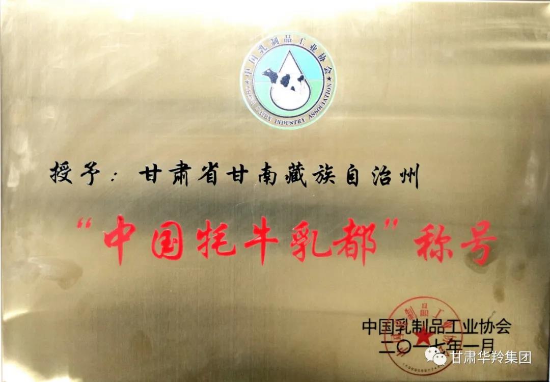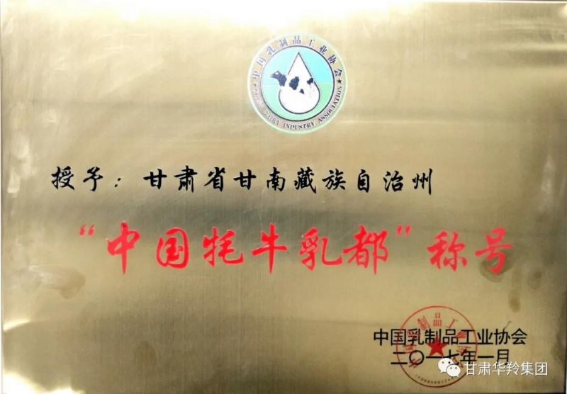 2017年1月,在甘南藏族自治州人民政府、甘南州工信局和甘肅華羚乳品集團在內的多方積極努力下,在中國乳制品工業協會的關心指導下,甘南藏族自治州榮獲了“中國牦牛乳都”榮譽稱號。